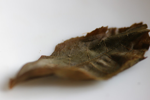 And after rubbing - one leaf stayed firm, the other one crumbled miserably. This suggests that it is not that simple with the "wetness test" of aged puerh (rubbing leaves and checking if they break).